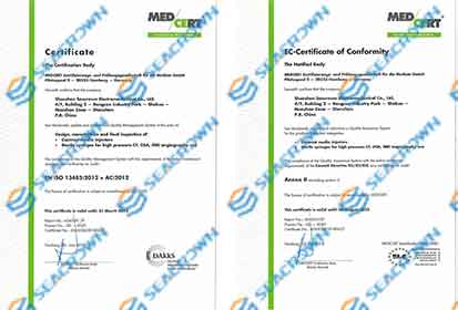 全面實施ISO9001和ISO13485質量管理體系,專業(yè)醫(yī)療器械公告機構德國勞氏MEDCERT現(xiàn)場考核,通過ISO 13485:2003質量管理體系認證,產品獲得CE認證證書。