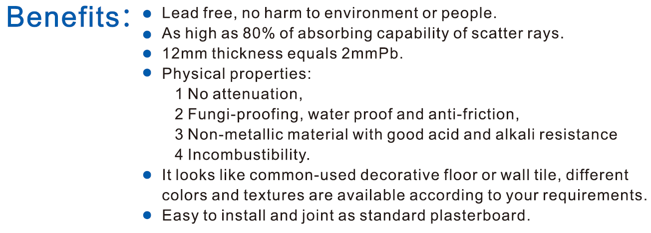 Lead free radiation shielding panel owns beautiful decorative surface and superior radiation shielding performance.Based on "Absorbing Boundary Theory", the product's scattered ray absorption rate is higher than 80%.