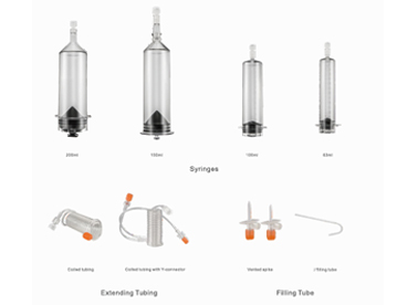 本品有高壓注射器專用針筒、高壓連接管、吸藥管、靜脈輸液管等耗材產品。針筒及附件套包由高壓注射器專用針筒、連接管路、接頭組成。本產品是高壓注射器配套使用的承載造影劑的一次性使用注射容器,適用于CT增強掃描及CT血管成像檢查。